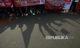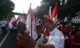 REPUBLIKA.CO.ID, JAKARTA -- Sejumlah massa yang menamakan diri relawan NKRI Cinta Damai mengarak bendera Indonesia saat karnaval cinta NKRI yang dilakukan saat Hari Bebas Kendaraan bermotor (HBKB) di Kawasan Thamrin, Jakarta Pusat, Ahad (20/11).