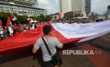 Ratusan relawan NKRI Cinta Damai mengarak bendera Indonesia saat karnaval cinta NKRI yang dilakukan saat Hari Bebas Kendaraan bermotor (HBKB) di Kawasan Thamrin, Jakarta Pusat, Ahad (20/11). (FOTO : Republika/Raisan Al Farisi)