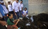 Calon Gubernur Banten nomor urut 1 Wahidin Halim (ketiga kanan) berdialog dengan nelayan pengolah rumput laut saat berkampanye di Kampung Susukan, Pontang, Serang, Banten, Rabu (23/11). (FOTO : Antara/Asep Fathulrahman)