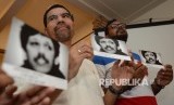 Mantan Anggota TPF dan Analis Politik dan HAM Amiruddin Al-Rahab (kiri) dan Koordinator Kontras Haris Azhar (kanan) menunjukan kartu pos yang bergambar Munir saat menggelar konferensi pers bersama media di Jakarta, Ahad (27/11). (FOTO : Republika/Raisan Al Farisi)