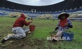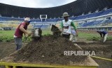 REPUBLIKA.CO.ID, BANDUNG -- Sejumlah petugas memperbaiki rumput di Stadion Gelora Bandung Lautan Api, Jalan Gedebage, Kota Bandung, Senin (28/11).