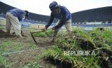 Sejumlah petugas memperbaiki rumput di Stadion Gelora Lautan Api, Jl Gedebage, Kota Bandung, Senin (28/11). (FOTO : Republika/Mahmud Muhyidin)