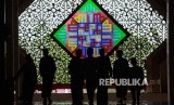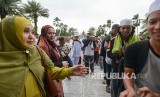 Penyanyi Evie Tamala (kiri) bersama Camelia Malik (kedua kiri) menyambut Ratusan peserta aksi 212 yang berasal dari Ciamis yang telah tiba di Masjid Agung At-tin, Jakarta, Kamis (1/12). (FOTO : Republika/Raisan Al Farisi)