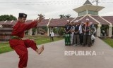 Silat betawi menyambut kedatangan ratusan peserta aksi 212 yang berasal dari Ciamis saat tiba di Masjid Agung At-tin, Jakarta, Kamis (1/12). (FOTO : Republika/Raisan Al Farisi)
