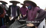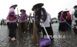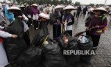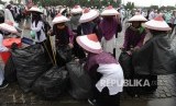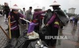 Santri asal Ciamis membersihkan sampah yang tertinggal usai berlangsungnya aksi Super Damai 212 di kawasan silang Monas,Jakarta, Jumat (2/12). (FOTO : Republika/Rakhmawaty La'lang)