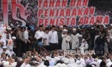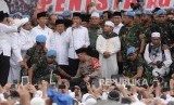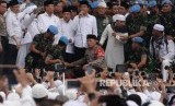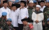 REPUBLIKA.CO.ID, JAKARTA -- Presiden Joko Widodo didampingi Wakil Presiden Jusuf Kalla, Menkopolhukam Wiranto dan Menteri Agama Lukman Hakim Syaifuddin berpidato di depan peserta Aksi 212 usai shalat Jumat di Silang Monas, Jakarta, Jumat (2/12).
