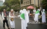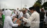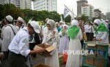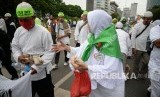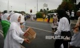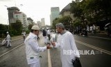 REPUBLIKA.CO.ID, JAKARTA -- Relawan perempuan membagikan makanan dan minuman kepada peserta aksi super damai 212 di Jalan MH Thamrin, Jakarta, Jumat (2/12).
