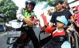 Seorang siswa penyandang disabilitas membagikan bunga kepada polisi saat mengikuti jalan santai memperingati hari Disabilitas Internasional di Blitar,Jawa Timur, Sabtu (3/12). (FOTO : Antara/Irfan Anshori)