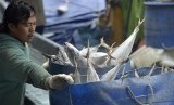 Pekerja memindahkan ikan tuna hasil tangkapan dari kapal di Pelabuhan Muara Baru, Jakarta, senin (5/12). (FOTO : Antara/Wahyu Putro A)