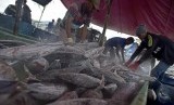 Pekerja memindahkan ikan tuna hasil tangkapan dari kapal di Pelabuhan Muara Baru, Jakarta, Senin (5/12). (FOTO : Antara/Wahyu Putro A)