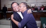 Terdakwa kasus dugaan korupsi pelepasan aset PT PWU Jatim, Dahlan Iskan (kanan) memeluk mantan Ketua MK Mahfud MD (kiri) seusai sidang lanjutan di Pengadilan Tindak Pidana Korupsi (Tipikor) Surabaya di Juanda, Sidoarjo, Jawa Timur, Selasa (6/12). (FOTO : Antara/Umarul Faruq)