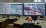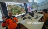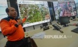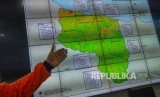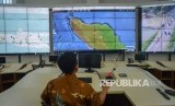 Petugas Badan Nasional Penanggulangan Bencana (BNPB) menunjukan daerah rawan bencana gempa di Pulau Sumatera melalui layar di ruang pemantauan bencana Gedung BNPB, Jakarta, Jumat (9/12). (FOTO : Republika/Raisan Al Farisi)