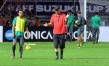 Pesepakbola Timnas Indonesia Manahati Lestusen (kiri) mendapat arahan pelatih Alfred Riedl (kedua kiri) pada uji coba lapangan Stadion Pakansari jelang laga melawan Thailand di Stadion Pakansari, Cibinong, Bogor, Jawa Barat, Rabu (13/12). (FOTO : Antara/Yulius Satria Wijaya)