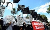 Ratusan anggota organisasi masyarakat (ormas) Hizbut Tahrir Indonesia (HTI) menggelar aksi unjuk rasa di depan Gedung Sate, Jalan Diponegoro, Kota Bandung, Jumat (16/12). (FOTO : Mahmud Muhyidin)