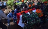 Peti jenazah Serma TNI Khudori dimasukkan ke liang lahat saat pemakaman di Dusun Ponen, Desa Pulogedang, Tembelang, Jombang, Jawa Timur, Senin (19/12). (FOTO : Antara/Syaiful Arif)
