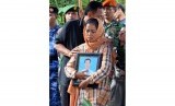 Yuli Khoirotin Niswah mendekap foto suaminya Serma TNI Khudori di pemakaman umum Dusun Ponen, Desa Pulogedang, Tembelang, Jombang, Jawa Timur, Senin (19/12). (FOTO : Antara/Syaiful Arif)