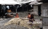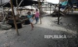 Anak-anak bermain di tempat pengupasa kerang hijau yang tidak ada aktifitas di Muara Angke, Jakarta, Rabu (21/12). (FOTO : Republika/Wihdan Hidayat)