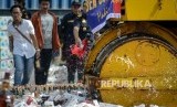 Alat berat memusnahkan ribuan minuman keras dan rokok hasil sitaan bea cukai di halaman gedung Bea Cukai, Jakarta Timur, Jumat (23/12). (FOTO : Republika/Raisan Al Farisi)