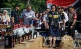 Menteri Keuangan Sri Mulyani (tengah) memeriksa minuman keras sebelum pemusnahan barang ilegal hasil sitaan bea cukai di halaman gedung Bea Cukai, Jakarta Timur, Jumat (23/12). (FOTO : Republika/Raisan Al Farisi)
