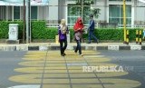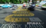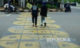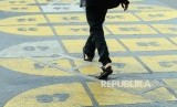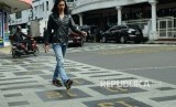 REPUBLIKA.CO.ID, BANDUNG -- Seorang warga melintasi zebra cross berbentuk songlah di Jalan Braga, Kota Bandung, Rabu (28/12).