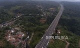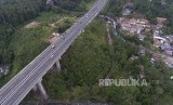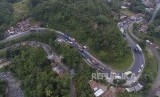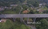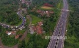 Foto udara kawasan Cisomang Kabupaten Bandung Barat, Kamis (29/12) Kendaraan golongan dua yang terdiri truk dan bus harus melintasi jalan arteri di dekat Jembatan Cisomang jalan Tol Pubaleunyi KM 100 yang mengalami pergeseran di Kabupaten Purwakarta. (FOTO : Wahyu Putro/Antara)