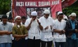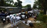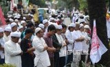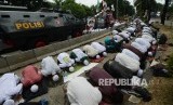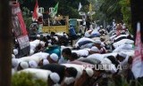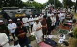Ratusan massa yang tergabung dalam GNPF MUI Shalat Dzuhur berjamaah saat melakukan aksi kawal sidang ahok dengan agenda pemeriksaan saksi di Auditorium Kementerian Pertanian, Jakarta Selatan, Selasa (3/1). (FOTO : Republika/ Raisan Al Farisi)