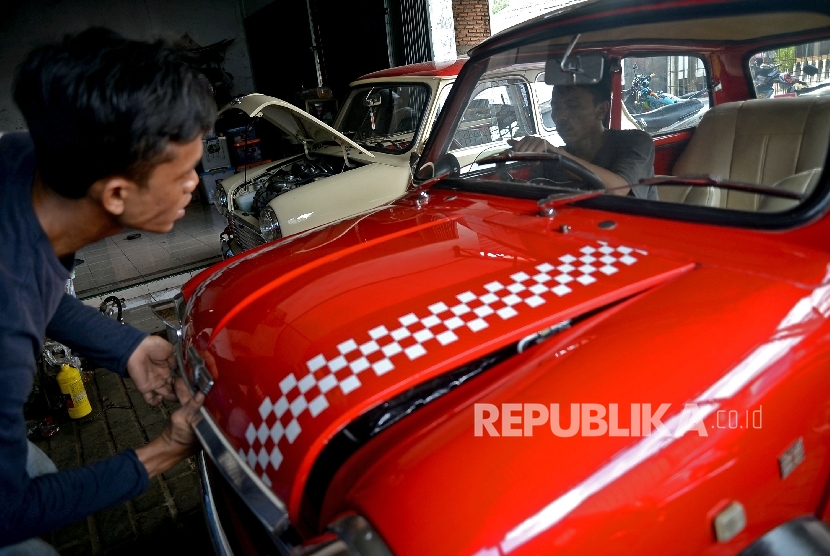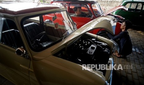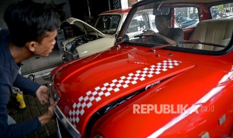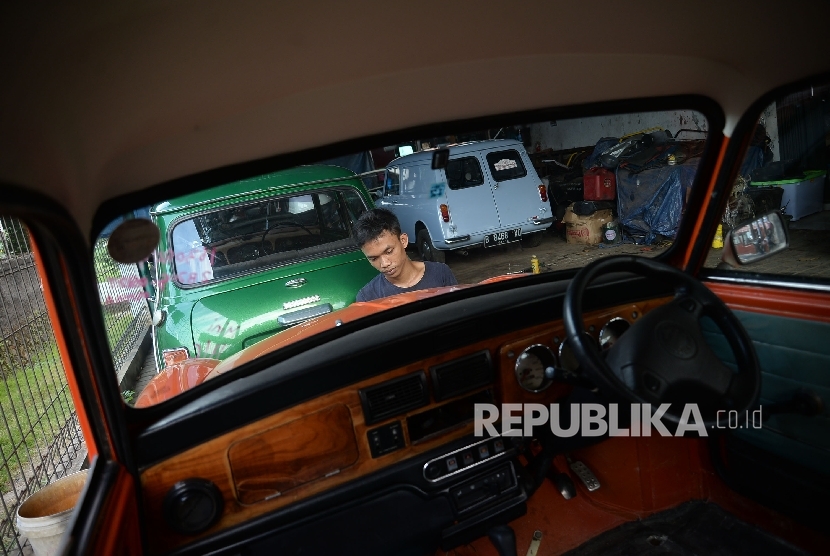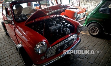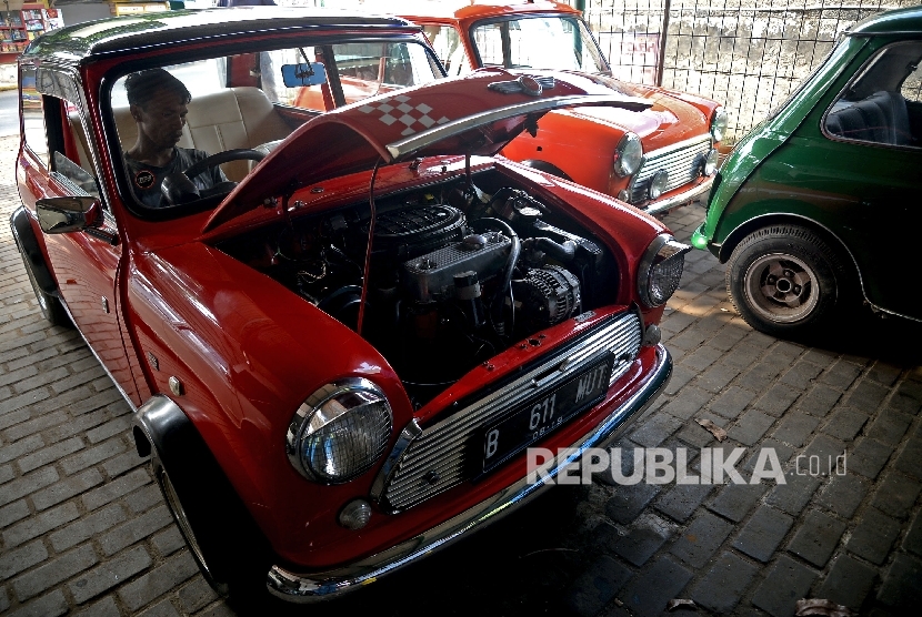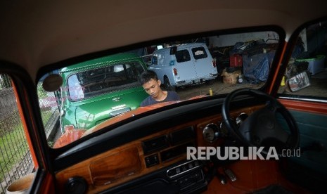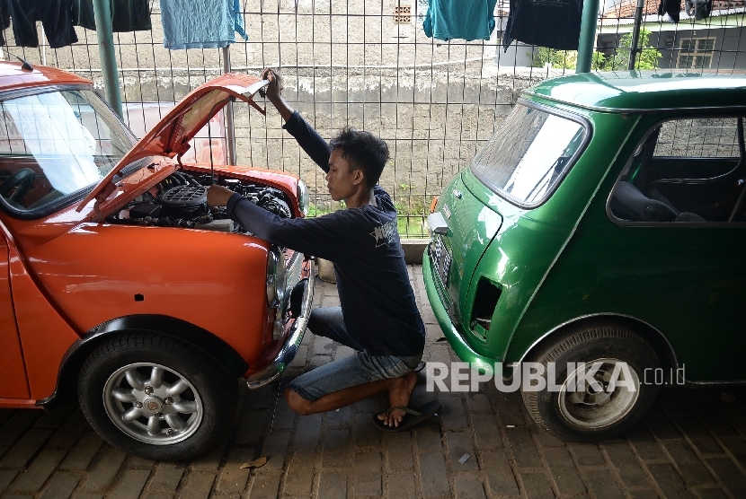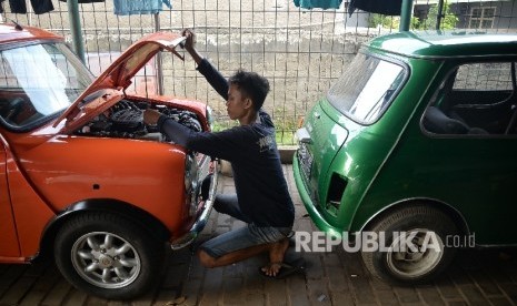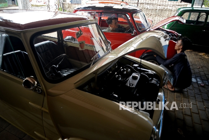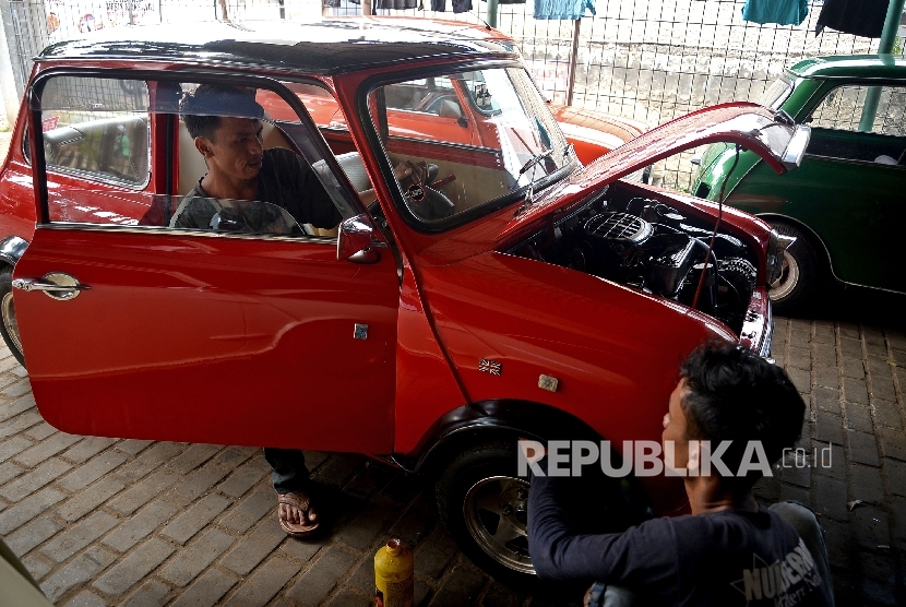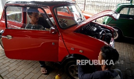 Montir melakukan perbaikan mobil mini klasik di bengkel QQ Mini Morris, Jatimurni, Bekasi, Jawa Barat,Selasa (3/1). (FOTO : Republika/Prayogi)