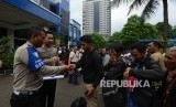 Anggota kepiolisian memberikan nomor antrean kepada warga untuk mengurus perpanjangan di Direkorat Lalu Lintas Polda Metro Jaya, Jakarta, Kamis (5/1). (FOTO : Republika/Raisan Al Farisi)