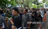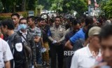 Seorang anggota kepolisian memberikan arahan kepada warga yang antre untuk mengurus perpanjangan di Direkorat Lalu Lintas Polda Metro Jaya, Jakarta, Kamis (5/1). (FOTO : Republika/Raisan Al Farisi)