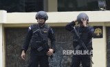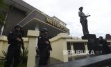Dua orang anggota Kepolisian dengan senjata lengkap menjaga jalannya aksi FPI di depan Mabes Polri, Jakarta, Senin (16/1). (FOTO : Republika/Raisan Al Farisi)