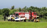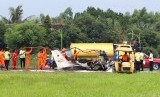 Sejumlah petugas mengevakuasi bangkai pesawat latih yang gagal landing di Bandara Blimbingsari, Banyuwangi, Jawa Timur, Senin (16/1). (FOTO : Antara/Budi Candra Setya)