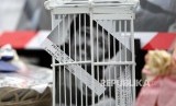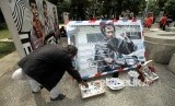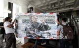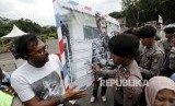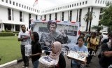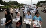 Aktivis Kontras melakukan aksi menyampaikan Kartu Pos Desak Presiden Selesaikan Kasus Munir di Jalan Medan Merdeka Utara, Jakarta, Selasa (17/1). (FOTO : Republika/Rakhmawaty La'lang)
