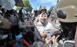 Seorang warga mencoba menghadang petugas kepolisian yang mengawal eksekusi tanah di Kapalo Koto, Padang, Sumatera Barat, Rabu (18/1). (FOTO : Antara/Iggoy el Fitra)