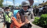 Seorang polwan memegangi seorang warga yang meminta penundaan eksekusi rumah mereka, di Kelurahan Limau Manis, Pauh, Padang, Sumatera Barat, Rabu (18/1). (FOTO : Antara/Iggoy El Fitra)