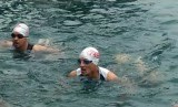 Calon Wakil Gubernur DKI Jakarta nomor urut 3, Sandiaga Uno (kanan), berenang dari Pulau Karya ke Pulau Panggang lalu ke Pulau Pramuka saat sosialisasi program di wilayah Kepulauan Seribu, Jakarta, Sabtu (21/1). (FOTO : ist)