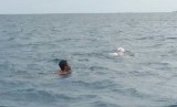 Calon Wakil Gubernur DKI Jakarta nomor urut 3, Sandiaga Uno, berenang dari Pulau Karya ke Pulau Panggang lalu ke Pulau Pramuka saat sosialisasi program di wilayah Kepulauan Seribu, Jakarta, Sabtu (21/1). (FOTO : Republika/Lintar Satria Zulfikar)