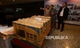 Petugas memeriksa barang bukti terkait kasus dugaan tindak pidana pencucian uang (TPPU) dengan tersangka Amie Hamid di Kantor Pusat Dirjen Pajak, Jakarta, Kamis (26/1). (FOTO : Republika/Raisan Al Farisi)