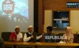 Ustadz Erick Yusuf (kanan) didampingi Tim medsos Pesantren Digital Habibie Yukejaen (kiri), bintang tamu Aji Wijayanto dan artis Eddies Adelia (kiri-kanan), menyampaikan paparannya pada acara Grand Lounching Pesantren Digital di Jakarta, Jumat (27/1). (FOTO : Republika / Darmawan)