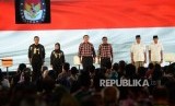 Tiga pasangan cagub DKI, Agus Harimurti-Sylviana Murni, Basuki Tjahaja Purnama-Djarot Saiful Hidayat, dan Anis Baswedan-Sandiaga Uno saat mengikuti debat cagub-cawagub DKI Jakarta ke-2 di Jakarta, Jumat (27/1) malam. (FOTO : Republika/Wihdan Hidayat)