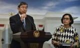Menteri Keuangan Sri Mulyani bersama Presiden Asian Development Bank (ADB) Takehiko Nakao menyampaikan keterangan kepada wartawan usai bertemu dengan Presiden Joko Widodo di kantor Presiden, Jakarta, Rabu (1/2). (FOTO : Antara/Puspa Perwitasari)
