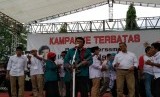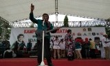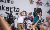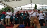REPUBLIKA.CO.ID,JAKARTA -- Calon Gubernur DKI Jakarta Anies Baswedan joget bersama Ketua Umum Partai Idaman (Islam Damai Aman) Rhoma Irama saat kampanye terbatas di Cibubur, Jakarta, Kamis (2/2).