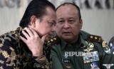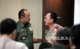 Pangdam Jaya Mayjen TNI Teddy Lhaksmana (kiri) berbincang bersama Kapolda Metro Jaya M Iriawan usai memberikan keterangan pers usai menggelar pertemuan bersama di Gedung KPU DKI Jakarta, Selasa (7/2). (FOTO : Republika/Rakhmawaty La'lang)