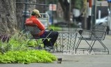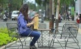 Seorang warga duduk dikursi yang ada di trotoar Kawasan Jalan Ir H. Djuanda (Dago), Kota Bandung, Senin (13/2).  (FOTO : Republika/Mahmud Muhyidin)