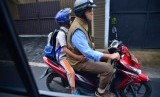 REPUBLIKA.CO.ID, JAKARTA -- Memanfaatkan masa tenang Pilkada, Calon Gubernur DKI Jakarta Anies Baswedan mengantarkan anaknya menggunakan sepeda motor ke sekolah di kawasan Lebak Bulus, Jakarta Selatan, Senin (13/2) pagi.
