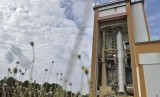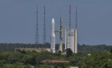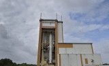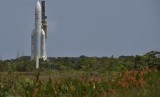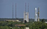 Roket Ariane 5 yang membawa satelit Telkom 3S dipersiapkan menempati titik luncur di fasilitas milik Arianespace, Kourou, Guyana Perancis, Senin (13/2). (FOTO : Antara/Puspa Perwitasari)