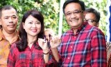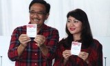 Calon Wakil Gubernur DKI Jakarta Nomor Urut Dua, Djarot Saiful Hidayat (kiri) bersama istrinya Happy Farida (kanan) menunjukkan surat suara usai menggunakan hak pilih di TPS 8, Kuningan, Jakarta, Rabu (15/2). (FOTO : Antara/Rivan Awal Lingga)
