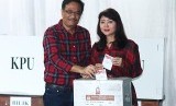 Calon Wakil Gubernur DKI Jakarta Nomor Urut Dua, Djarot Saiful Hidayat (kiri) bersama istri, Happy Farida (kanan) memasukkan surat suara saat menggunakan hak pilih di TPS 8, Kuningan, Jakarta, Rabu (15/2). (FOTO : Antara/Rivan Awal Lingga)