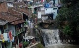 Pengendara melintasi kawasan pemukiman padat penduduk di pinggir kawasan Sungai Cikapundung, Bandung, Jawa Barat, Kamis (23/2). Pada tahun 2017, Pemkot Bandung menyiapkan anggaran sebesar Rp120 miliar untuk renovasi dan pembangunan Rumah Deret (FOTO : Fahrul Jayadiputra/Antara)