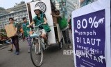 Aktivis mengenakan sepeda saat aksi Dukung Indonesia Bebas Sampah di Bundaran HI, Jakarta, Ahad (26/2). (FOTO : Republika/Agung Supriyanto)