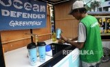 Aktivis mengisi air kedalam tempat minum tempat minum saat aksi Dukung Indonesia Bebas Sampah di Bundaran HI, Jakarta, Ahad (26/2). (FOTO : Republika/Agung Supriyanto)
